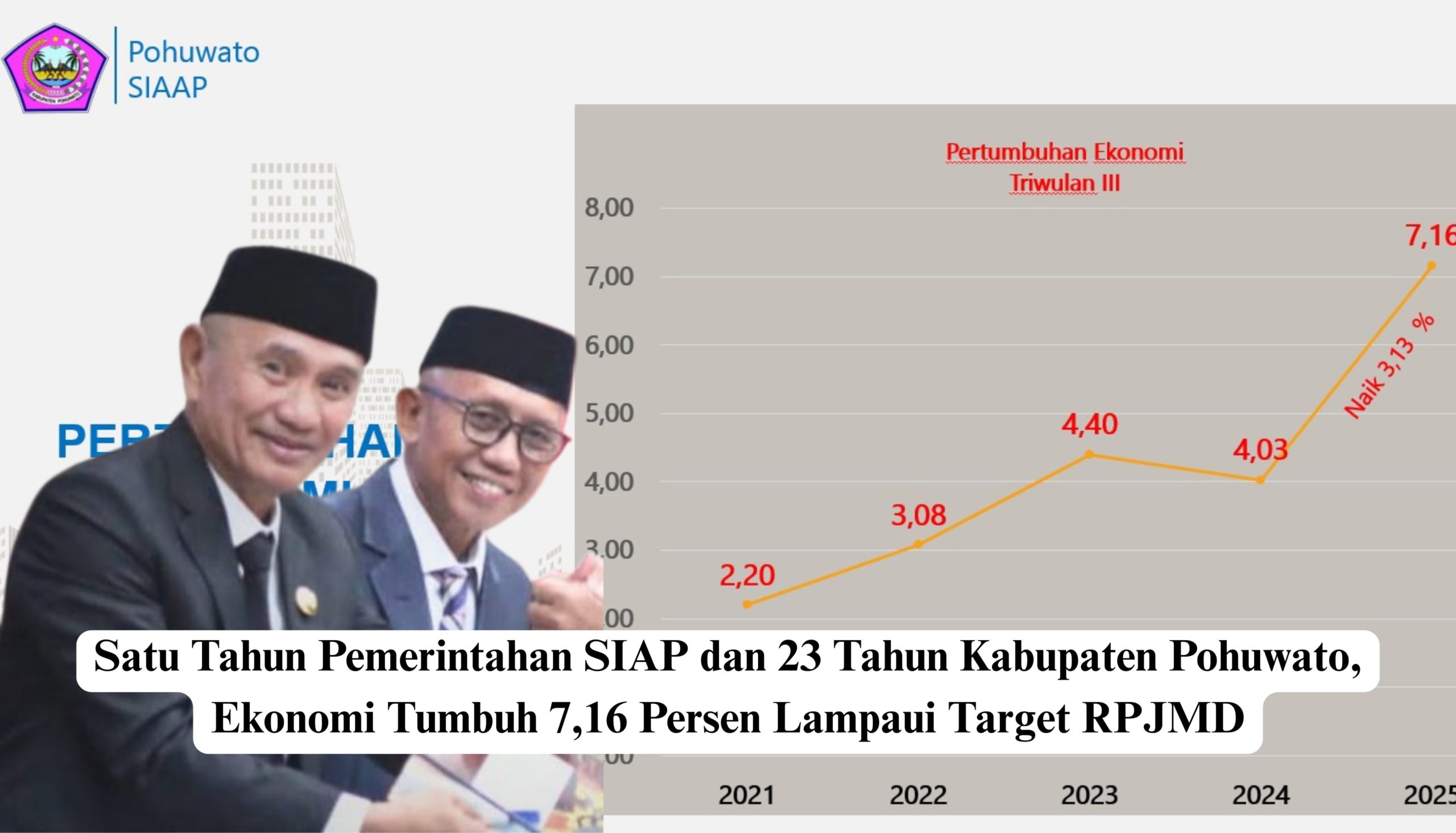 POHUWATO – Momentum satu tahun Pemerintahan SIAP bertepatan dengan peringatan 23 tahun Kabupaten Pohuwato diwarnai capaian positif pada sektor ekonomi. Pertumbuhan ekonomi daerah menunjukkan tren peningkatan signifikan dan berhasil melampaui target yang telah ditetapkan dalam RPJMD.